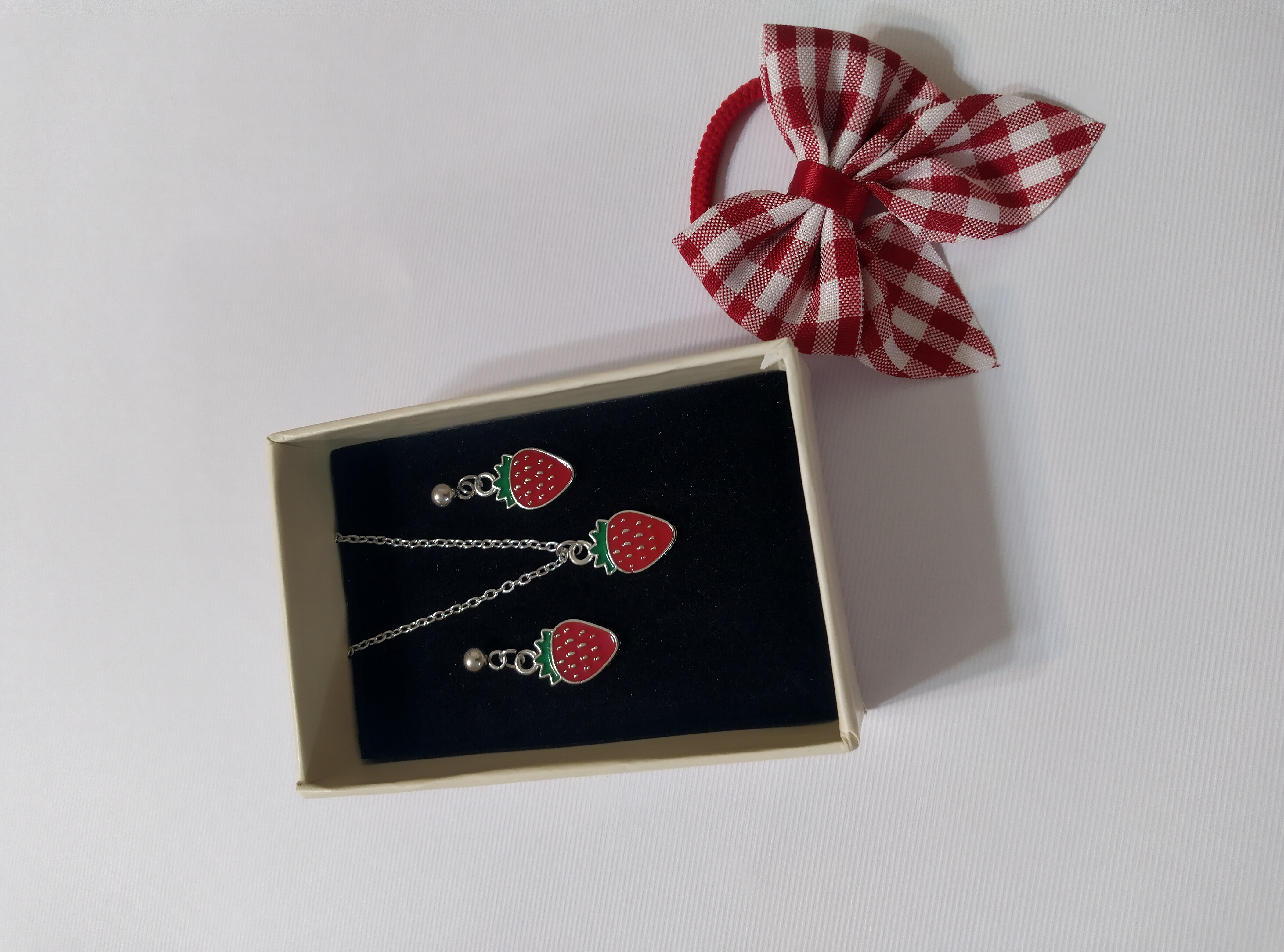 پک هدیه توت فرنگی 🍓😍 شامل: یک عدد گردنبند توت فرنگی،یک جفت گوشواره میخی زنجیر و پلاکها استیل و رنگ ثابت یک عدد کش پاپیونی🎀 به همراه باکس و روبان