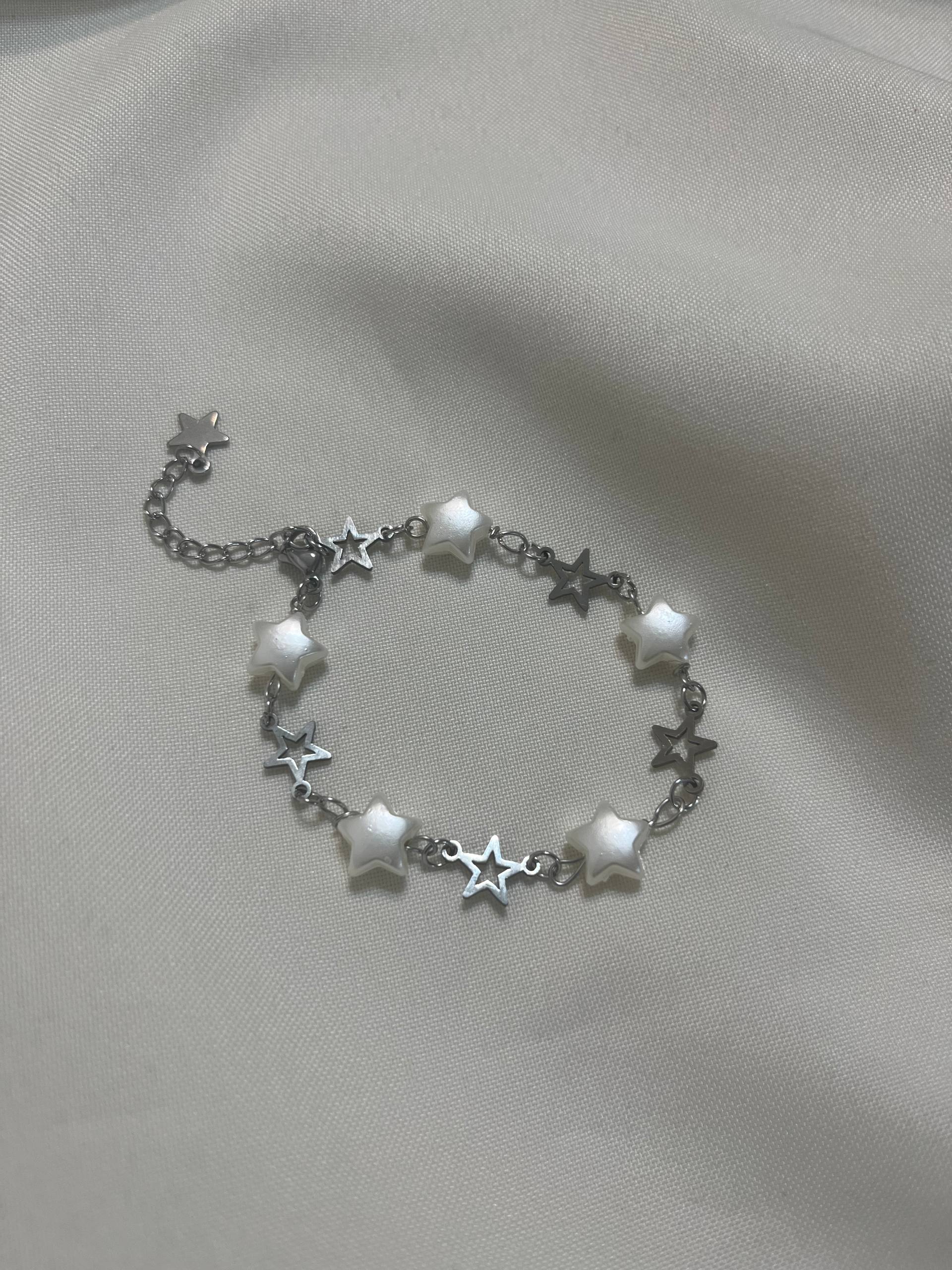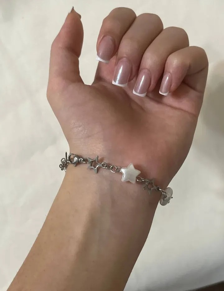 دستبند صدفی دستساز ✨ متریال مورد استفاده استیل و رنگ ثابت ستاره های صدفی طرح صدف میباشند طول دستبند ۱۵سانت +۵سانت زنجیر تنظیم سایز